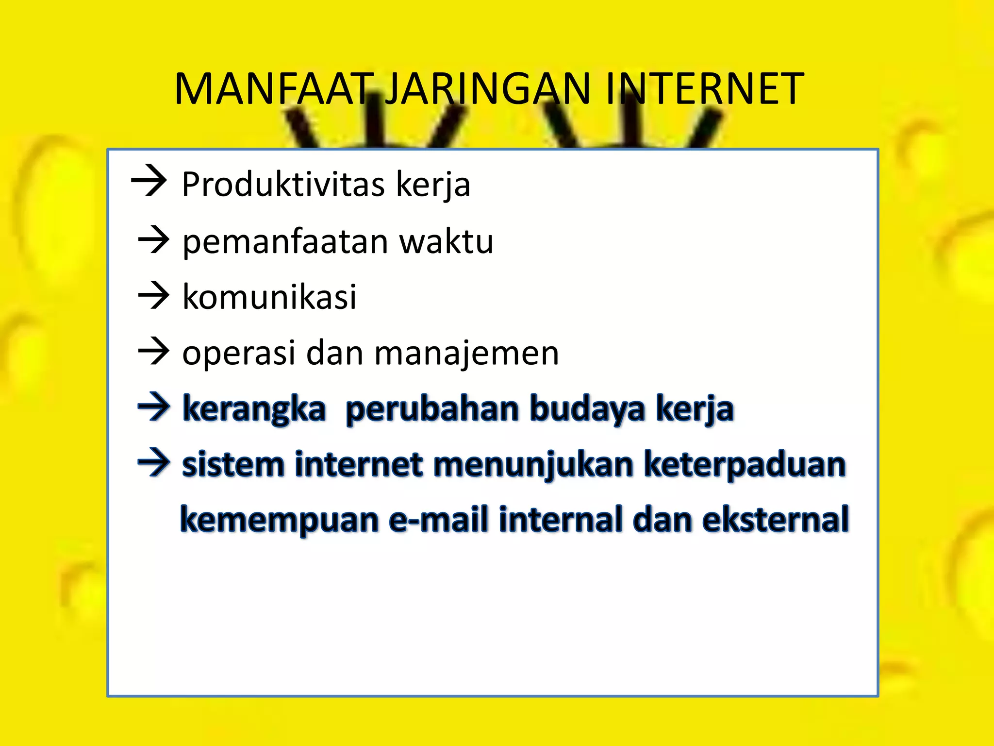 Dokumen ini membahas manfaat dan dampak internet, termasuk bidang pendidikan, pemerintahan, ekonomi, dan sosial, serta berbagai dampak negatifnya. Selain itu, dijelaskan pengertian internet dan intranet, fasilitas-fasilitas yang tersedia di internet, serta jenis dan topologi jaringan komputer. Jaringan komputer juga dibagi berdasarkan metode distribusi data, hubungan fungsional, dan jangkauan wilayah.