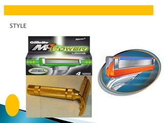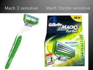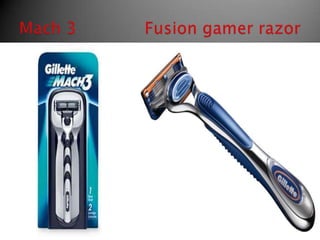 The document discusses Gillette's shaving equipment product line. It offers razors like the Fusion, Mach 3, and Fusion Gamer razor. It also provides shaving gels, foams, and aftershaves. Gillette uses different pricing strategies for its products. It sells its products in Bangladesh through distributors and retailers like supermarkets and stores, using selective coverage. It promotes its brand through television, newspaper, and magazine advertising.