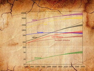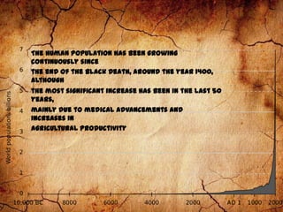 The human population has grown from under 250 million in the early 19th century to over 7 billion currently due to decreasing mortality rates. Population is projected to reach 8-10.5 billion by 2050. Rapid urbanization and population growth are straining resources and causing environmental damage. Proposed solutions include expanding access to contraception and education, implementing population policies, and developing space colonization.