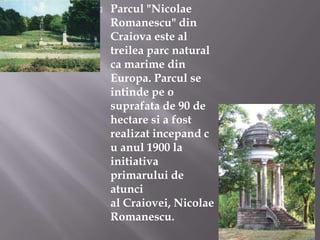 Parcul Nicolae Romanescu din Craiova este al treilea parc natural ca mărime din Europa, având o suprafață de 90 de hectare. Inaugurat pe 29 septembrie 1903, parcul a fost realizat de arhitectul Emile Rendont și găzduiește o gradină zoologică deschisă în 1906. Printre caracteristicile sale se numără lacul de patru hectare și numeroase construcții ingenioase pentru acea perioadă.