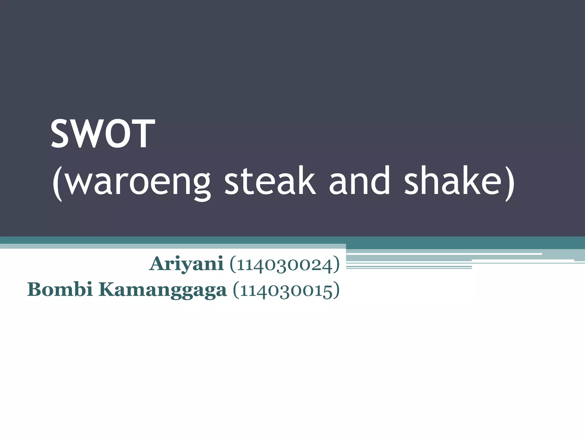 (1) Dokumen tersebut melakukan analisis SWOT terhadap Waroeng Steak and Shake yang menjual berbagai menu masakan Eropa dengan cita rasa Indonesia;