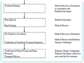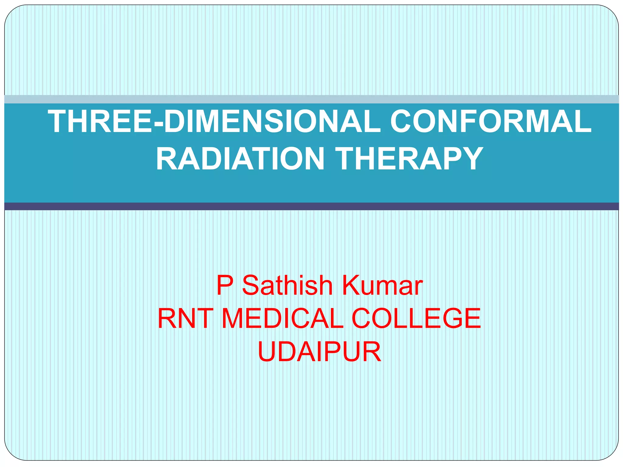 3-D conformal radiation therapy (3-D CRT) aims to conform the high radiation dose region to the target volume while reducing dose to surrounding normal tissues. The process involves immobilizing the patient, obtaining images like CT and MRI to define targets and organs at risk, delineating these structures, and planning radiation beams individually shaped to the target only. Key volumes defined include the gross tumor, clinical target, planning target, and organ at risk volumes.