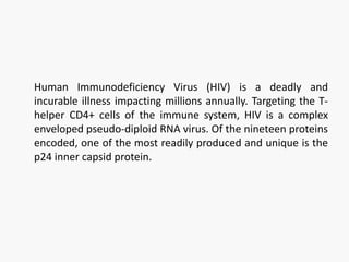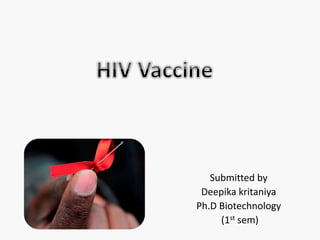 This document discusses the challenges involved in developing an HIV vaccine. It provides background on HIV, describing it as a retrovirus that targets CD4+ T cells. It reviews past vaccine trials, noting the only modest success of the RV144 trial. It discusses the massive diversity of HIV strains as a major challenge. It outlines various vaccine design strategies that have been pursued, including recombinant proteins, DNA vaccines, viral vectors, and approaches using broadly neutralizing antibodies. Throughout, it emphasizes the need for a vaccine to elicit robust cellular and humoral immune responses against a wide range of HIV subtypes to achieve protective efficacy.