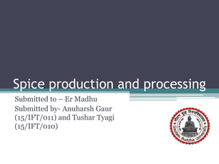 This document discusses spice production and processing. It begins with an introduction to spices, their history of use, and major producing regions. It then describes the major divisions of spices and pre-processing steps like cleaning, drying, and grading. Technological aspects of grinding and sterilization methods like ethylene oxide fumigation, irradiation, steam treatment and high pressure processing are explained. Spice oleoresins and conclusions on ensuring food safety through innovative processing are also covered. The document provides an overview of spice cultivation, production processes and technologies used to add value and ensure safety of spices.