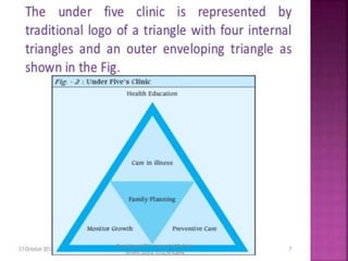 The document summarizes the services provided at an under five clinic. The clinic provides preventative, curative, referral, and educational services to children under five years old under one roof. The overall goal is to provide comprehensive healthcare to young children in a specialized facility. The clinic treats acute and chronic illnesses, monitors growth through periodic weighing and measurement, provides immunizations and nutrition care, and educates mothers on childcare.
