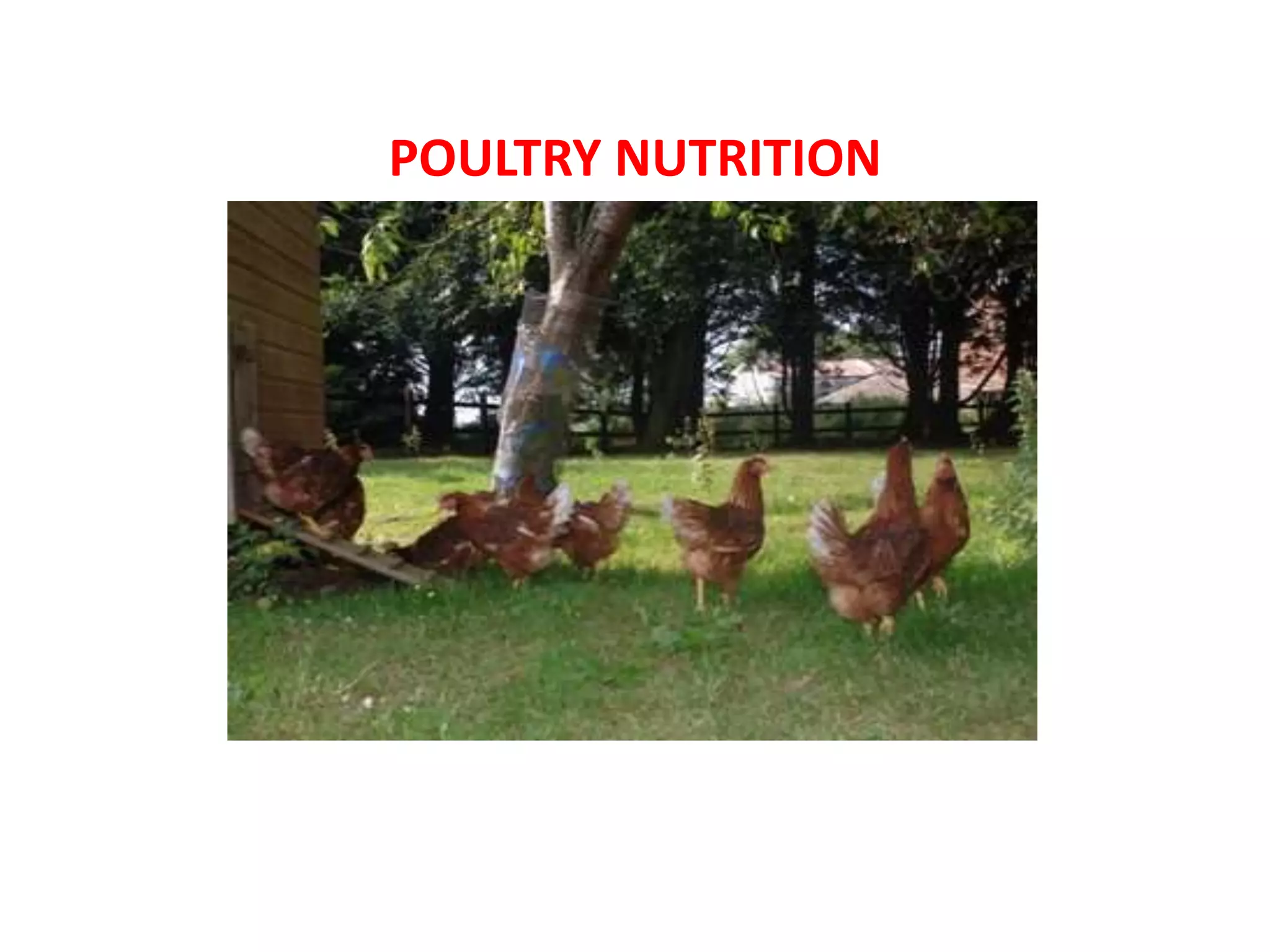 The document provides information on poultry nutrition, including the structure and function of the poultry digestive system, nutrient requirements, factors affecting feed intake, and diet formulation. The key points are: