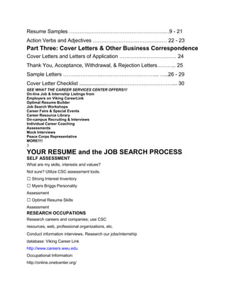 The document provides advice and guidance on creating effective resumes and cover letters for job applications. It discusses the job search process and importance of self-assessment. Key resume sections and formatting tips are outlined, such as using a chronological or skills-based format. Sample resumes, cover letter templates, and lists of common skills employers seek are also included to help students develop strong application materials.