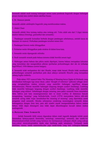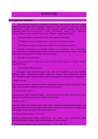 Dokumen tersebut membahas tentang pengertian semantik dan jenis-jenisnya. Semantik adalah ilmu yang mempelajari makna dalam bahasa, terutama hubungan antara tanda bahasa dengan makna. Terdapat beberapa jenis semantik seperti semantik leksikal yang mempelajari makna kata, semantik gramatikal yang mempelajari makna dalam tataran gramatika, dan semantik kontekstual yang mempelajari perubahan makna
