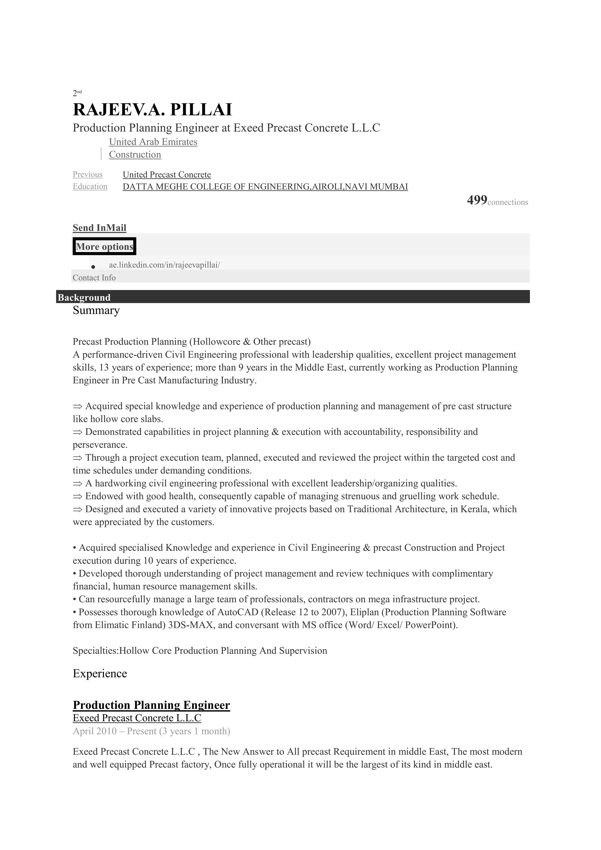 This document is a LinkedIn profile for Rajeev A. Pillai, who has over 13 years of experience working in production planning for precast concrete companies in the United Arab Emirates. He currently works as a Production Planning Engineer for Exeed Precast Concrete, where he is responsible for overall production planning. Previously, he held similar roles at United Precast Concrete, where he gained specialized knowledge and experience in precast construction and project execution over 10 years. He has expertise in hollow core production planning and supervision.