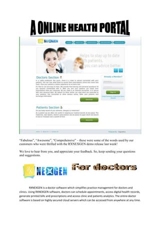 rxnexgen is a cloud-based practice management software designed for doctors and clinics that automates daily activities, such as scheduling appointments and accessing health records, to improve efficiency. The software includes patient portals that enable secure online interactions between patients and healthcare providers, facilitating better communication and access to medical information. Customer feedback has been overwhelmingly positive, describing the software as comprehensive and helpful in managing a doctor's practice.