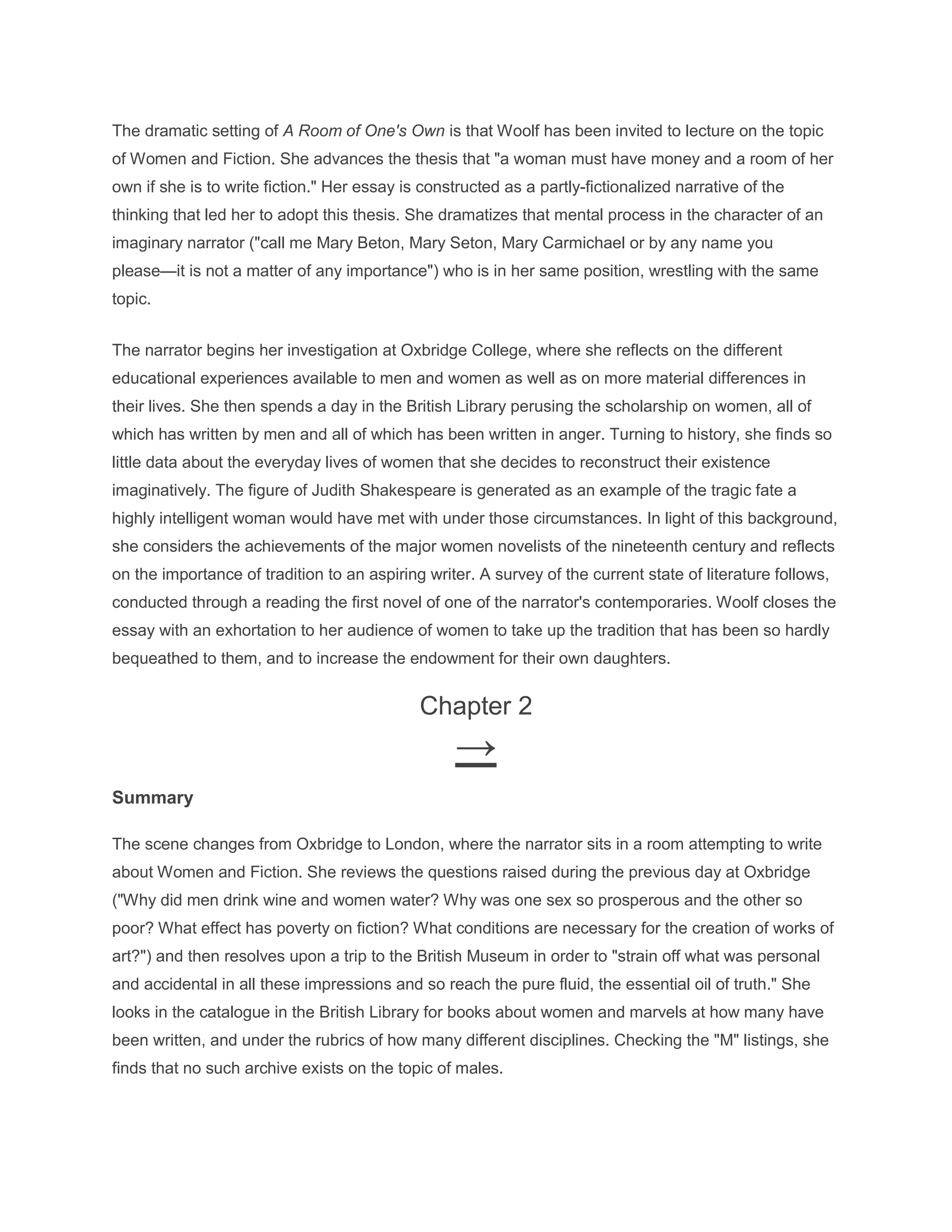 The narrator analyzes the emergence of women writers in England from the 16th century onward. She traces how aristocratic women like Lady Winchilsea and Margaret Cavendish were among the first to write, despite public disapproval, due to their relative freedom and resources. The letters of Dorothy Osborne reveal a verbal gift alongside disdain for women who write. Aphra Behn was a turning point as a middle-class woman who made a living through writing in defiance of conventions. This paved the way for 19th century novelists like Jane Austen and George Eliot. The narrator theorizes why the novel became the preferred form for these early women writers.