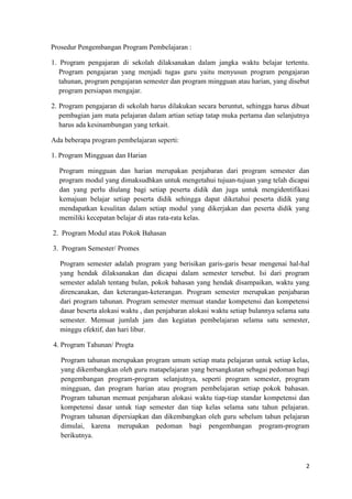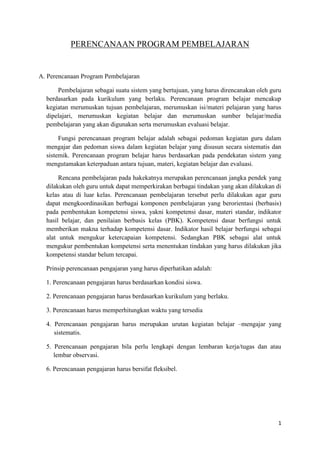 Perencanaan program pembelajaran merupakan perencanaan jangka pendek yang dilakukan guru untuk merencanakan tujuan, materi, metode, dan evaluasi pembelajaran berdasarkan kurikulum. Program pembelajaran perlu disusun secara sistematis melalui program tahunan, semester, mingguan, dan harian untuk memandu proses pembelajaran.
