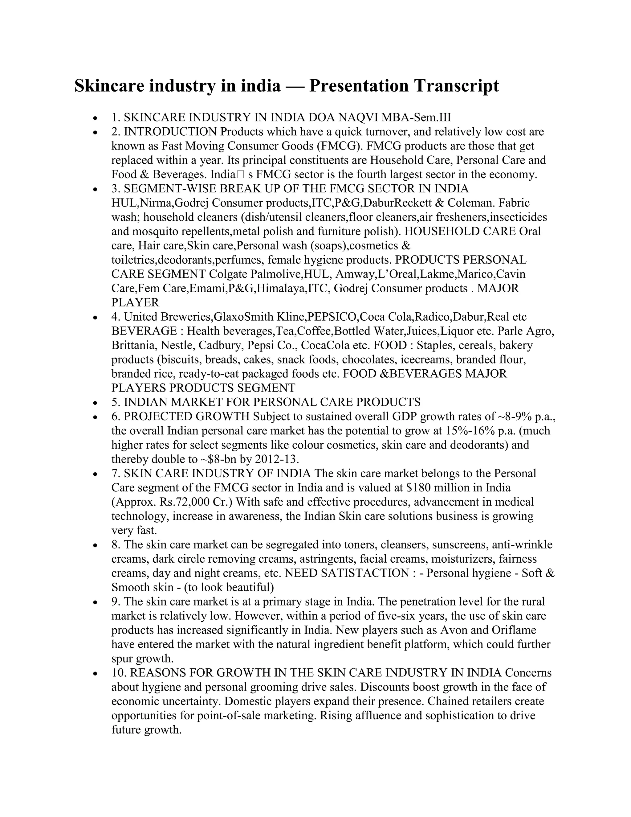 The skin care industry in India is valued at $180 million and is growing rapidly. It is part of the larger personal care segment of the fast moving consumer goods (FMCG) sector. Key factors driving the industry's growth include rising incomes, greater awareness of hygiene and grooming, and discounts promoting trial of new products. Major players include Hindustan Unilever, CavinKare, Godrej Consumer Products, and Emami. The industry has opportunities to tap the large untapped rural market and gain from rising incomes, but also faces threats from imports and possible regulatory changes.