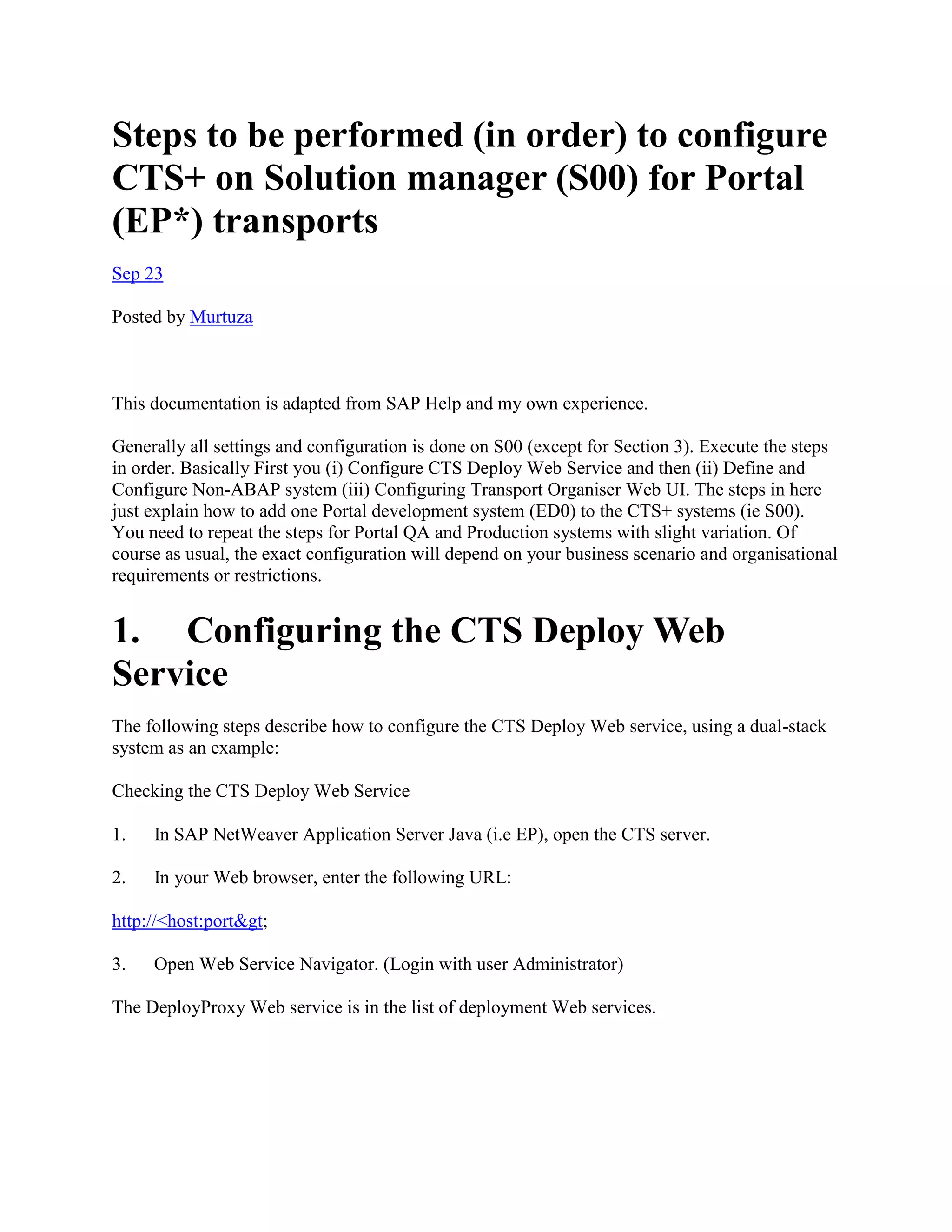The document provides steps to configure CTS+ on Solution Manager (S00) for Portal (EP*) transports. It involves: