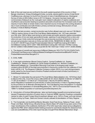 The document summarizes India's coal industry and reserves. It notes that bulk of India's coal reserves are located in certain southeastern states. While India has substantial coal reserves, production has been insufficient and controversies like coal allocation scams have arisen. Coal remains a key energy source for India in the coming decades. The document also reviews India's regulatory framework governing the coal industry and the major players like Coal India.