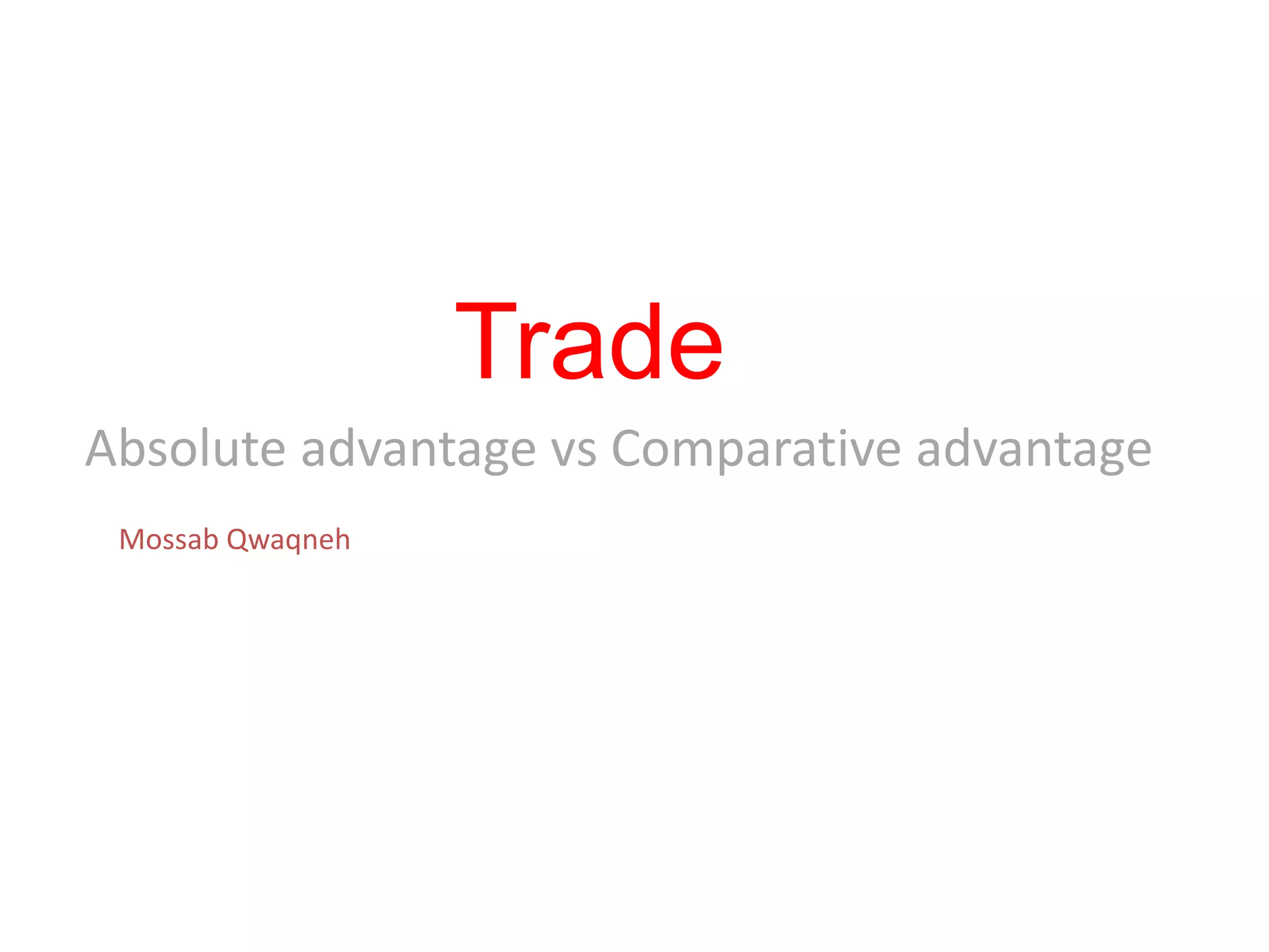 This document discusses absolute advantage and comparative advantage as they relate to international trade. Absolute advantage refers to when one country can produce goods more cheaply than another. Comparative advantage refers to a country specializing in producing goods where its opportunity costs are lowest. The key points are: (1) comparative advantage means that even if one country is less efficient, there are still gains from trade if opportunity costs differ; (2) countries should export goods where their comparative advantage is greatest and import goods where it is least; (3) factors like resource availability and combinations impact comparative advantage.