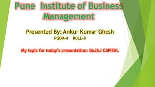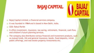 This presentation discusses Bajaj Capital, an Indian financial services company founded in 1964. It offers various financial services and products, including investment, insurance, retirement planning, and distributes mutual funds, insurance policies, bonds, and real estate investments. The presentation also covers the functions of human resources (HR) departments like staff management, competency development, and technology integration. It describes some common HR policies around recruitment, retention, leave, and performance evaluation. It then provides a job description and specification for a relationship manager role at Bajaj Capital and outlines their recruitment and selection process. Finally, it summarizes the key steps in Bajaj Capital's performance management system.