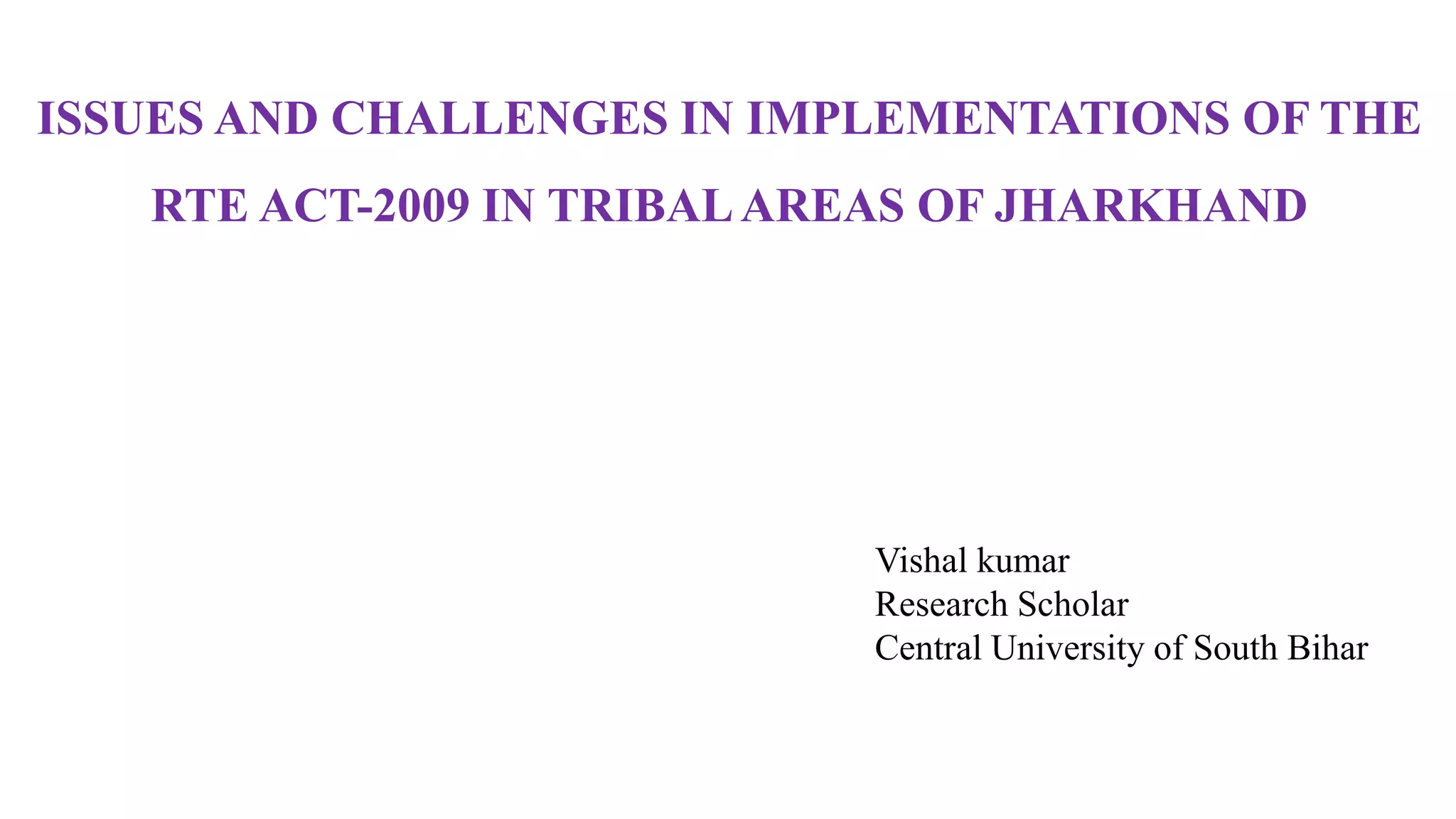 This document discusses issues and challenges in implementing the Right to Education Act of 2009 in tribal areas of Jharkhand, India. It notes that literacy rates among tribes in Jharkhand are significantly lower than national averages. The key issues identified include: parents not sending children to school; poverty; lack of awareness among parents about education's importance; single teacher schools with inadequate infrastructure and facilities; and a lack of trained and qualified teachers, especially those able to teach in local languages. Addressing these social, economic, and resource-based barriers is critical to improving education access and outcomes for tribal communities per the goals of the Right to Education Act.