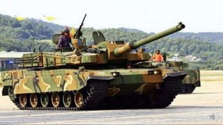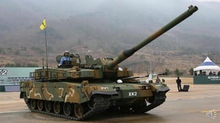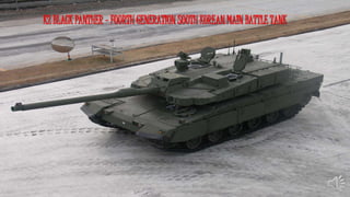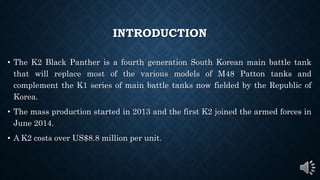 The K2 Black Panther is a South Korean main battle tank that began mass production in 2013. It has a crew of three and weighs 55 tons, powered by a 1,500hp engine. The K2 features composite and explosive reactive armor, as well as an active protection system for defense. It is equipped with a hunter-killer function and various sights for target detection, identification, and engagement.