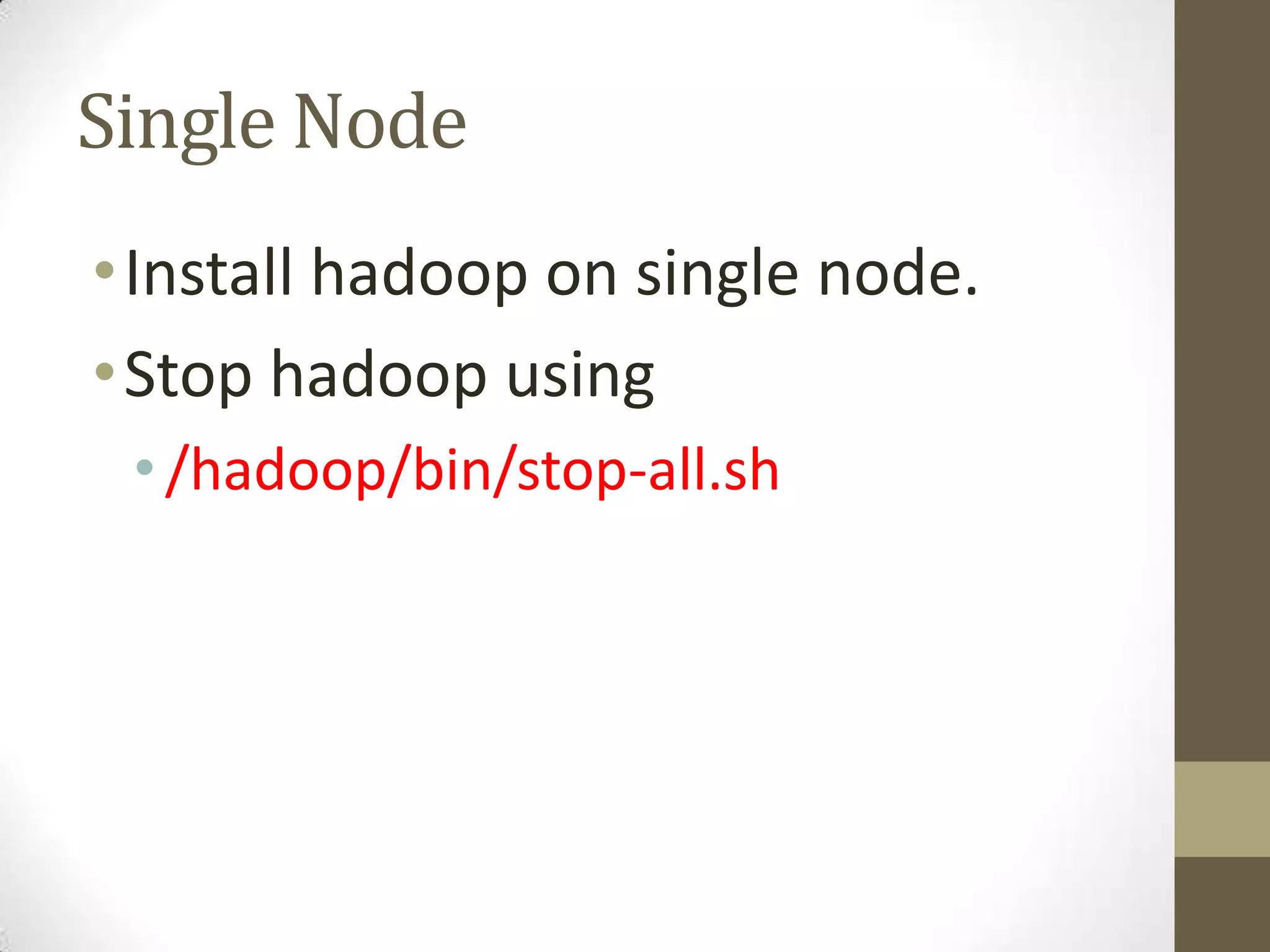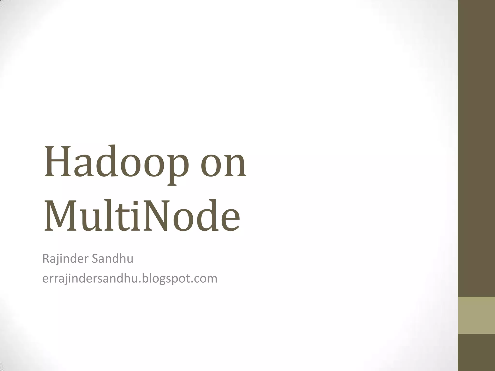 This document provides instructions for setting up a multi-node Hadoop cluster on multiple machines. It describes configuring networking and SSH access between nodes, editing configuration files, formatting the HDFS filesystem, and starting the Hadoop daemons and a sample MapReduce job.