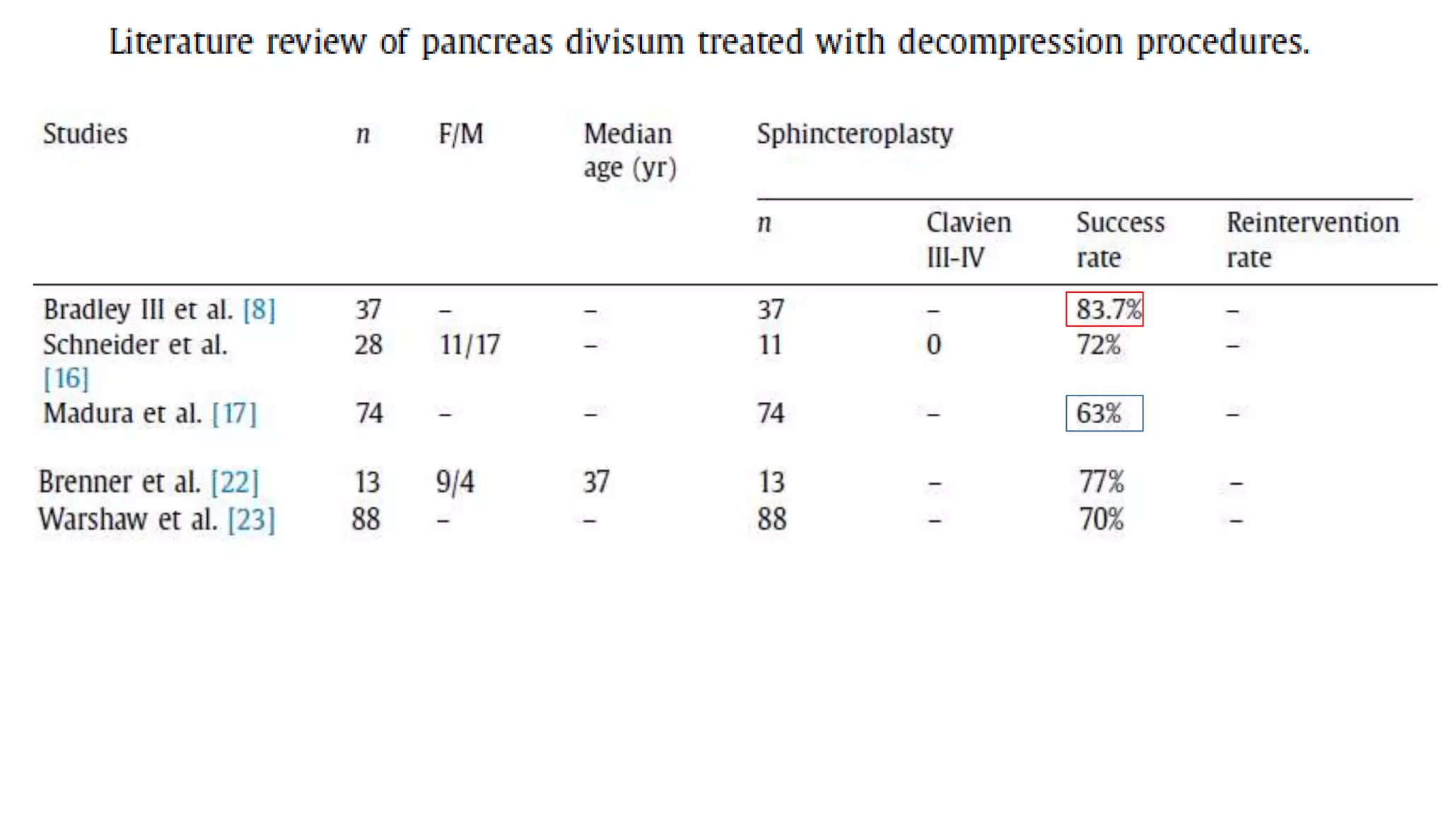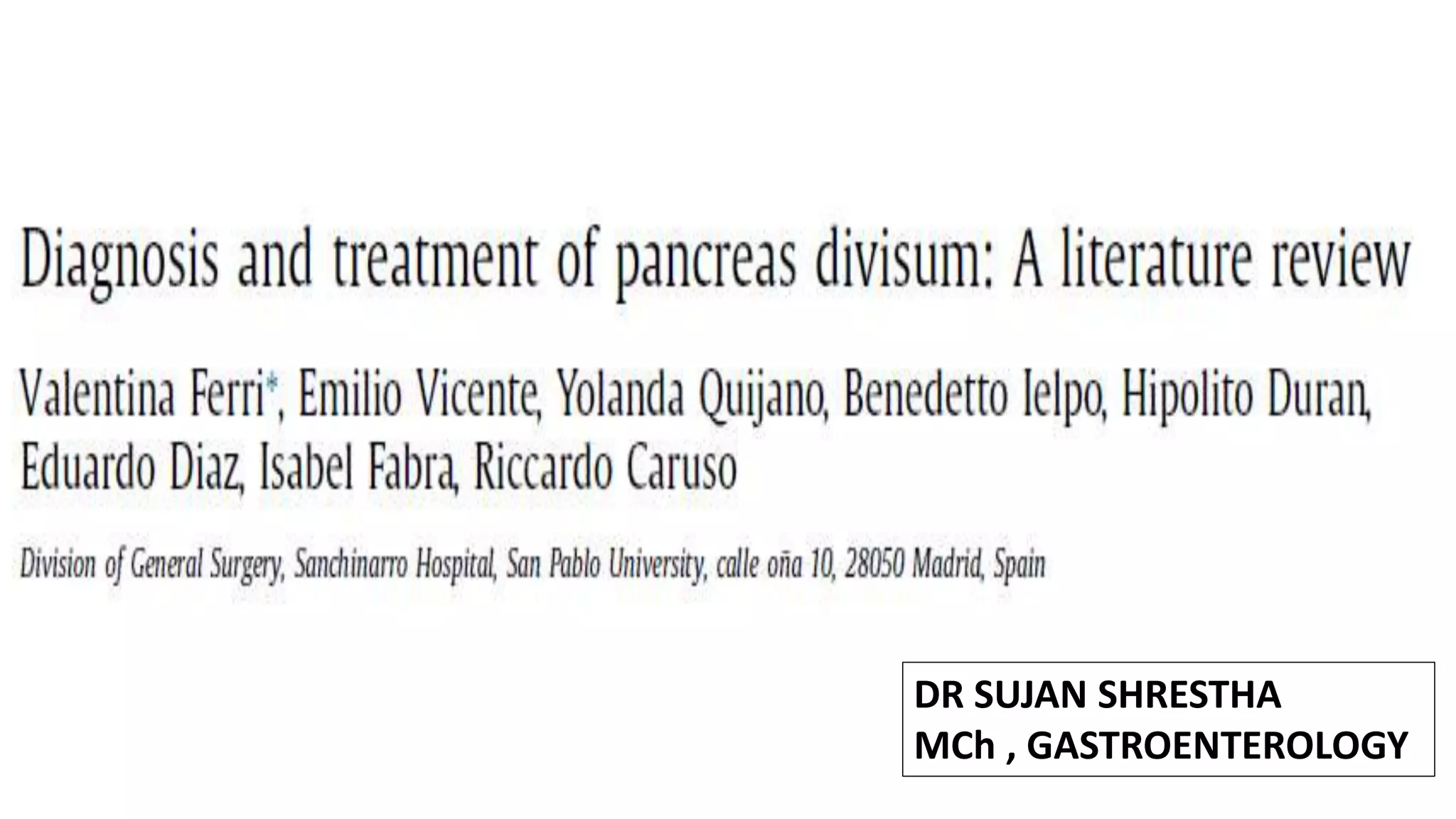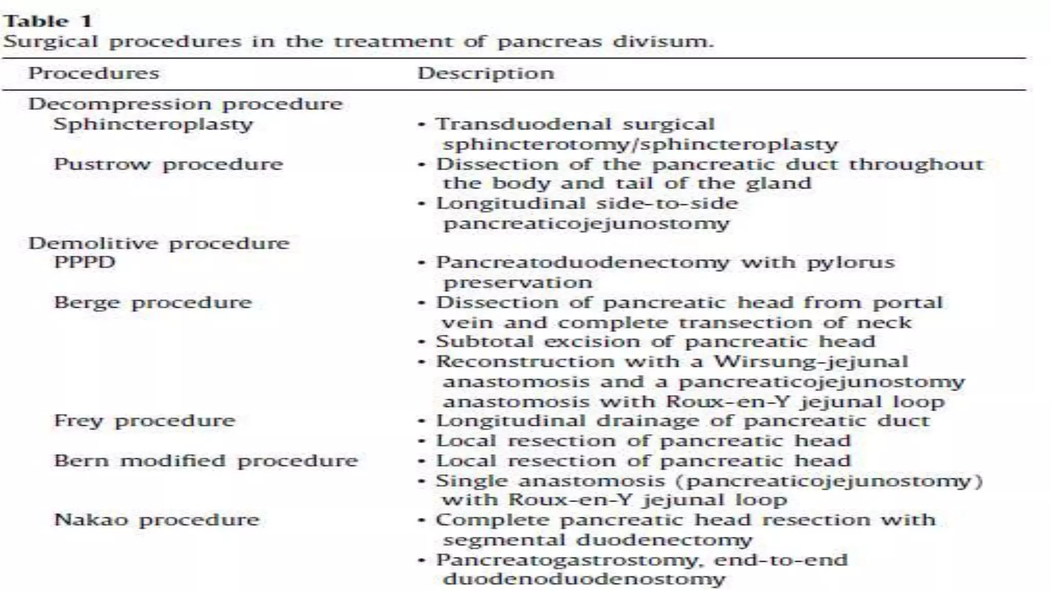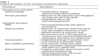 This document discusses pancreas divisum, a congenital anomaly where the pancreas does not fully fuse during development. It has a 5% incidence rate but only 5% of those are symptomatic. Symptomatic cases are due to increased pressure from drainage through the smaller Santorini duct rather than the main duct. Diagnosis is via ERCP or MRCP. Treatment options include endoscopic procedures like sphincterotomy of the minor papilla or surgery if endoscopy fails. Surgical options range from sphincteroplasty to reconstruct the drainage pathway to more extensive resections like pancreaticoduodenectomy.