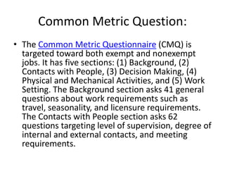 Functional job analysis (FJA) is a qualitative analysis method developed by the US Department of Labor to understand job roles. It breaks jobs down into 7 areas of worker actions and analyzes employee behavior within these areas. FJA provides benefits like a better understanding of employee and job roles, but can be harder to standardize across organizations than quantitative methods.