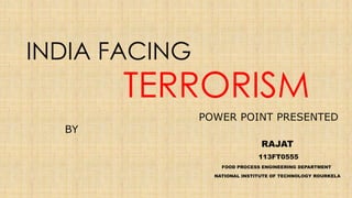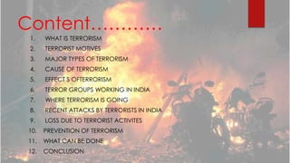 This PowerPoint presentation discusses terrorism in India. It defines terrorism, examines the causes and types of terrorism affecting India, and profiles some major terrorist groups operating there like Lashkar-e-Taiba. Recent terrorist attacks in India like the Mumbai attacks of 2008 are described in detail. The document also reviews India's anti-terrorism laws and their impacts, considers the short and long-term effects of terrorism, and concludes by calling for efforts to remove the roots of terrorism.