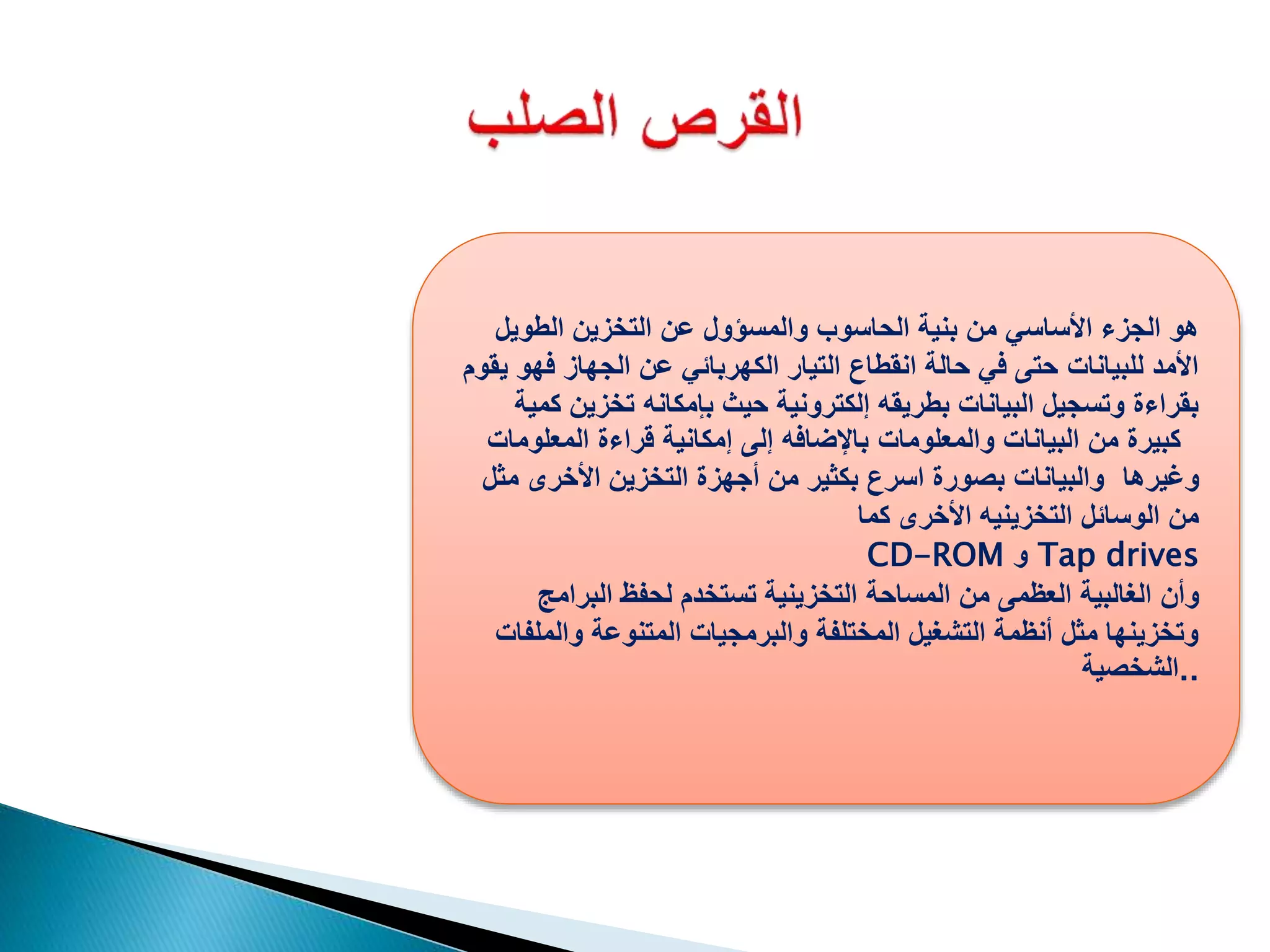 القرص الصلب هو جهاز تخزين أساسي يقوم بتخزين البيانات بطريقة إلكترونية، ويتألف من عدة مكونات مثل الأطباق الدائرية ورؤوس القراءة/الكتابة. يتطلب إدارته نظام ملفات لتنظيم البيانات وتحديد المساحة المستخدمة والحرّة. هناك أنواع مختلفة من الأقسام، بما في ذلك الأقسام الأساسية والمنطقية، وهي ضرورية لتهيئة القرص وتشغيل نظام التشغيل.
