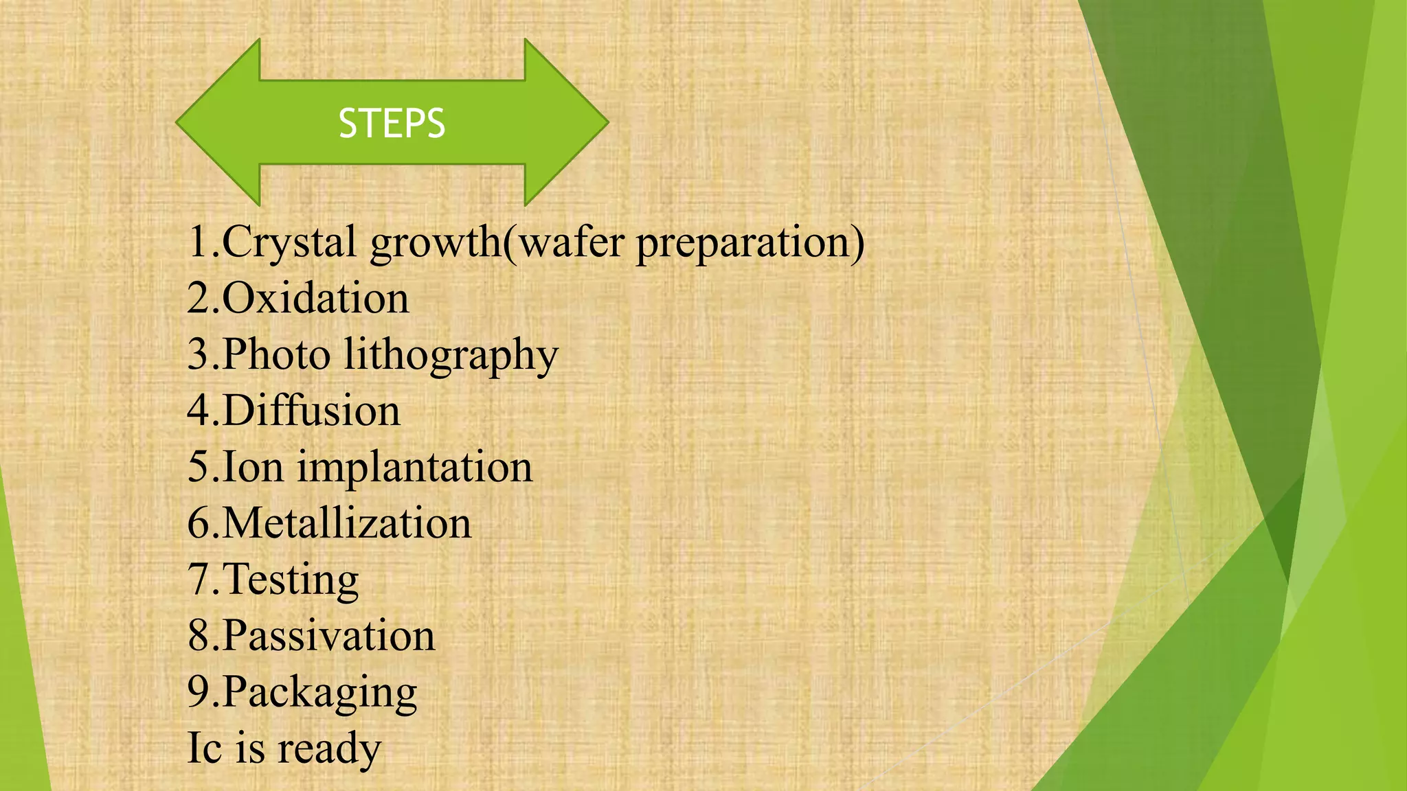 This document summarizes the key steps in integrated circuit fabrication: 1) wafer preparation through crystal growth, 2) oxidation, 3) photolithography, 4) diffusion, 5) ion implantation, 6) metallization, 7) testing, 8) passivation, and 9) packaging. It describes processes like Czochralski growth, oxidation, photolithography, diffusion, ion implantation, and metallization. It also discusses semiconductor types, apparatus used, and differences between diffusion, ion implantation, and doping. The document provides an overview of IC fabrication methods and processes.