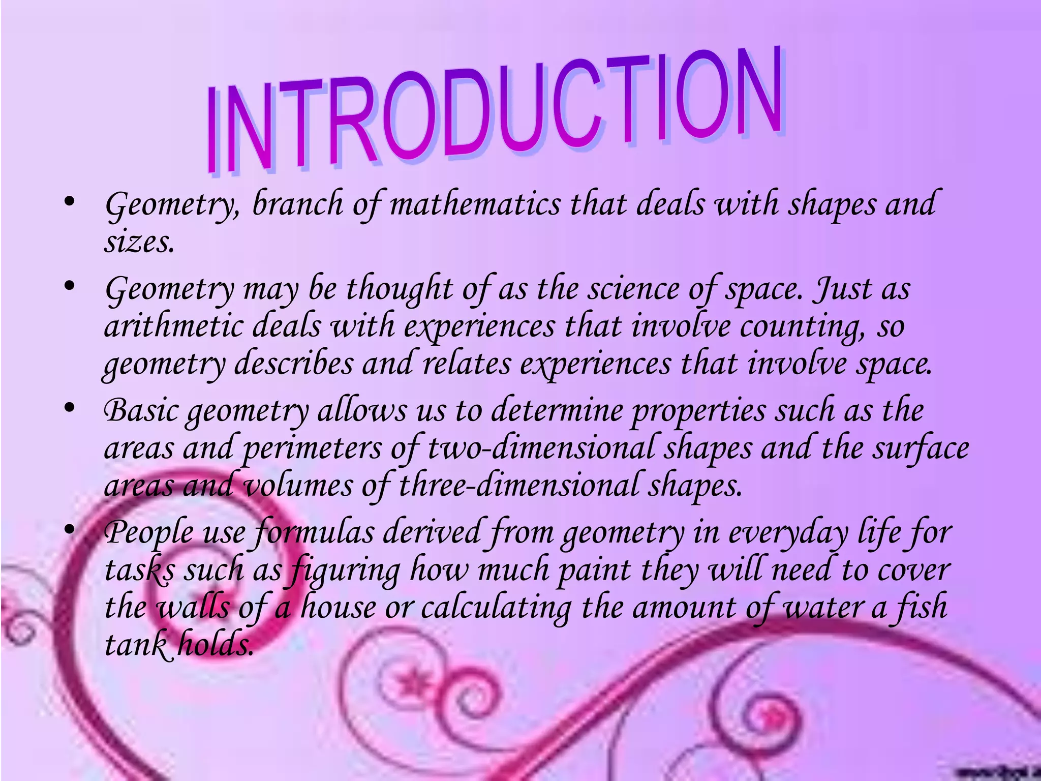 Geometry is the branch of mathematics dealing with shapes and sizes. Euclid was a Greek mathematician from around 300 BC who is best known for his influential textbook 'Elements', which laid out the foundations of geometry and logical deductive reasoning. The 'Elements' begins with plane geometry and uses just five axioms or postulates to prove many other geometric theorems. While some of Euclid's work built upon earlier mathematicians, he was the first to organize geometry into a comprehensive deductive system based on a small set of axioms.