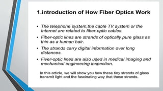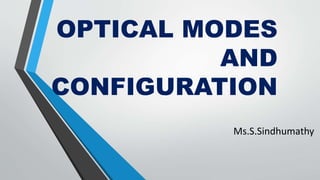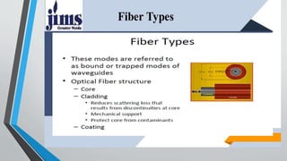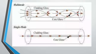 This document discusses different types of optical fibers and their configurations. There are three main types: single-mode fiber, which only allows one light ray and is used for long distance communication; multimode step-index fiber and multimode graded-index fiber, which allow multiple light rays but have greater signal degradation. Single-mode fiber has a small core diameter of 5um while multimode fiber has a larger core of 40um. Optical fibers are used widely in telecommunications, medicine, defense, and broadcasting due to their advantages of being economical, thin, low power consumption, and causing little signal degradation.
