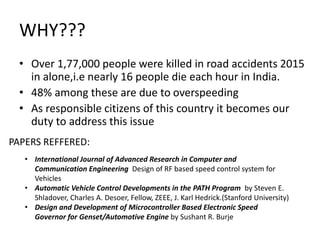 This document proposes an automated mechanical speed control device to reduce overspeeding of vehicles. The device uses an RF transmitter at speed limit zones that sends signals to a receiver (microprocessor). The microprocessor then actuates a mechanism that varies the vehicle's speed governor to regulate fuel flow and limit speed according to the transmitted signal. By controlling vehicle speed automatically, the goal is to help reduce the 48% of road accidents caused by overspeeding and make roads safer.