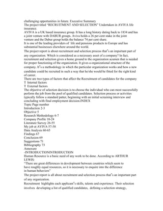 The document is a project report submitted by Saumya Mehta to the University of Pune on the topic of "Recruitment and Selection at AVIVA LIFE INSURANCE". It includes an introduction, certificates of completion, acknowledgements, executive summary and details about the company profile, literature review, data collection and analysis methods, findings and conclusions. The report examines the recruitment and selection process at AVIVA LIFE INSURANCE in India.