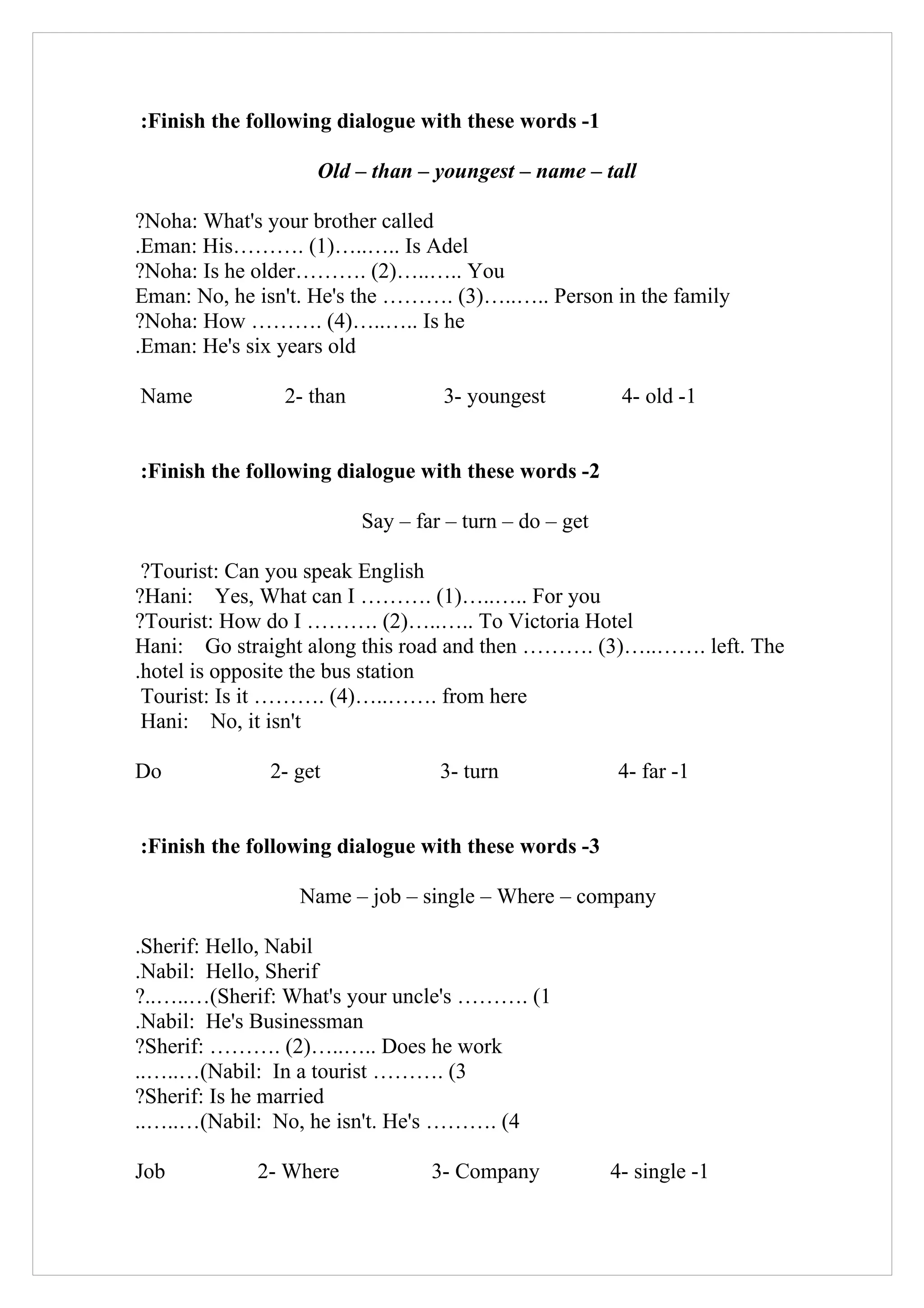The document provides instructions to complete missing words in several dialogues by selecting from given word options. The missing words are needed to finish conversations between people discussing various topics such as family members, occupations, locations, times and daily activities. The correct options are then chosen to complete the dialogues.