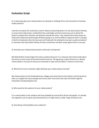 My radio bulletin follows existing radio conventions such as using jingles and loud music to attract listeners and gain their attention. It is well-scripted and divided into segments like introductions and interviews in the main part. The bulletin targets mature audiences aged 28 and older by presenting current local and world issues. It could be distributed near colleges and universities for faculty to listen since it targets mature audiences. The bulletin attracts a range of listeners aged 28 to 50 by including segments on sports and entertainment alongside news. The creator learned about using audio software like Adobe Audition and Audacity, and formats for mixing and converting sound through creating this radio bulletin.