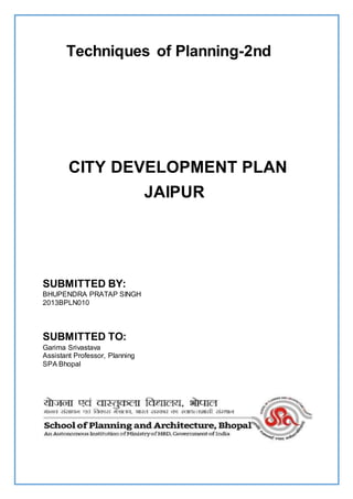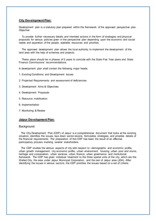 The document summarizes the City Development Plan (CDP) of Jaipur, India. The CDP studies various aspects of the city, including demographics, economic profile, environment, housing, services, and governance. It identifies issues in sectors like water supply, sewerage, solid waste management, transportation, and uncontrolled growth. The CDP aims to address these issues and guide the development of Jaipur in a sustainable manner through 2025 by formulating strategies, projects, and securing required investments. It was prepared through an effective participatory process involving stakeholders.
