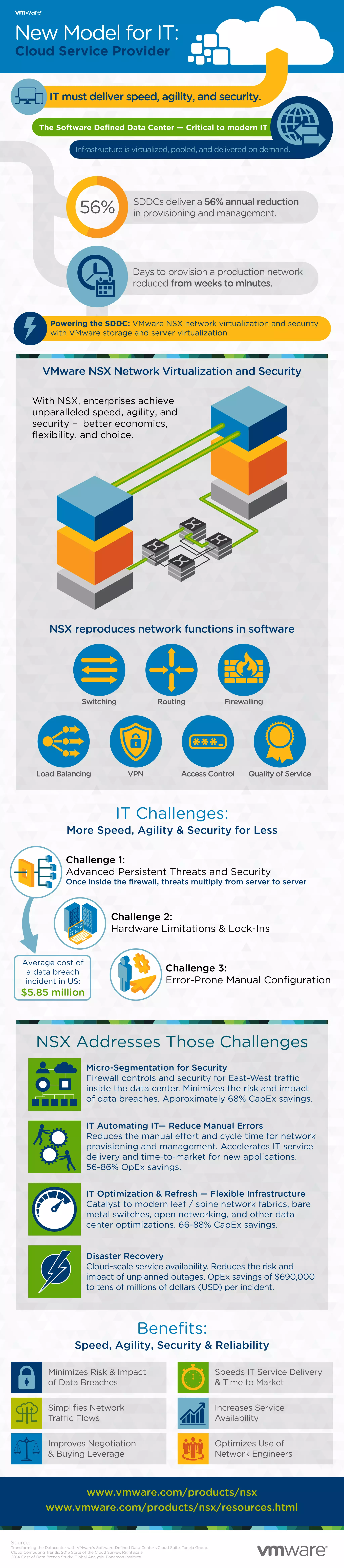 The document discusses VMware's software-defined data center (SDDC) and how VMware NSX enhances network virtualization and security, addressing challenges such as advanced persistent threats and hardware limitations. Key benefits include significant reductions in provisioning times, cost savings, and improved IT service delivery. Overall, NSX provides enterprises with unmatched speed, agility, and security while optimizing infrastructure and minimizing risks associated with data breaches.