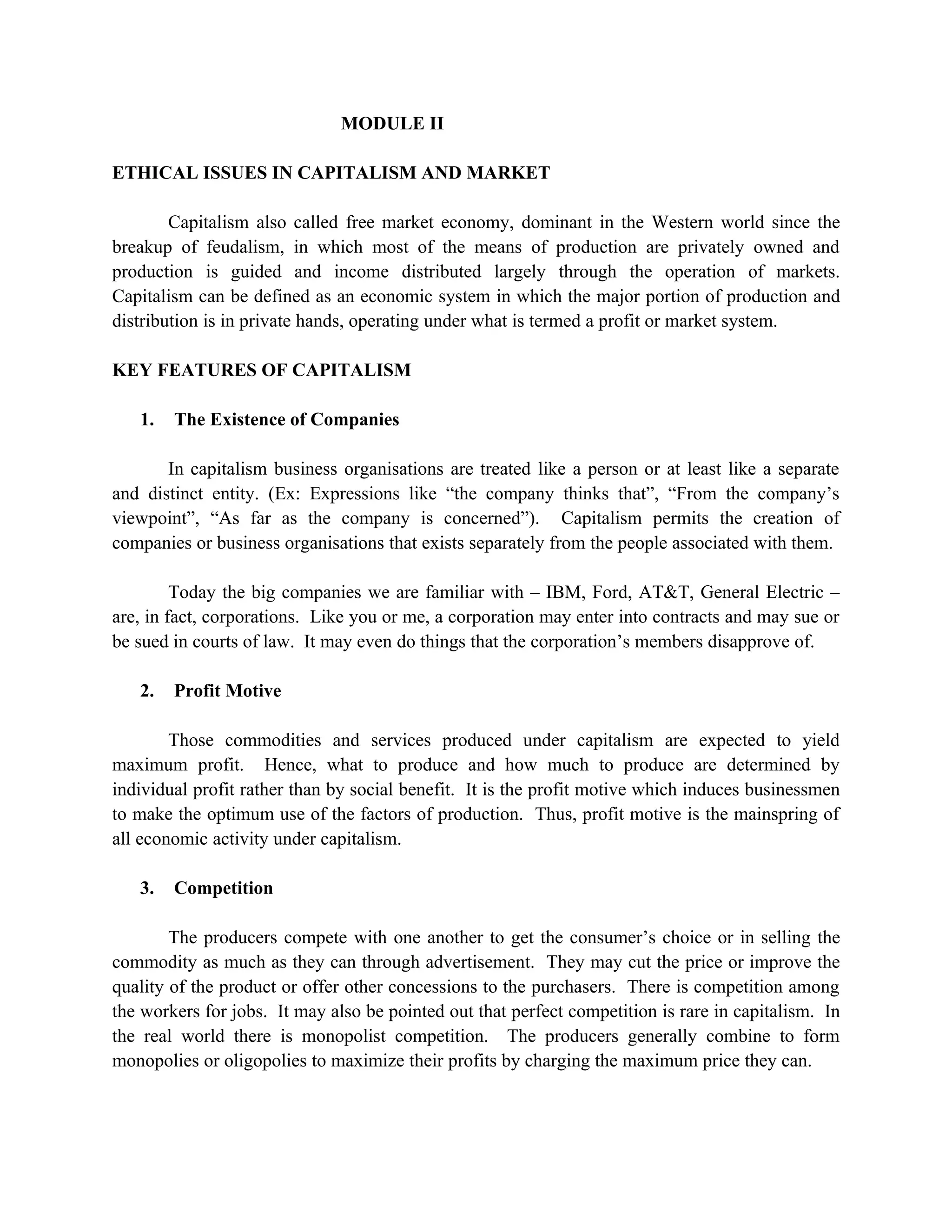 Capitalism is an economic system defined by private ownership of production assets and the operation of markets. It has key features like the existence of companies, a profit motive, competition between producers, freedom of enterprise, private property rights, economic inequalities, and the sovereignty of consumers. Supporters argue it is morally justified based on natural property rights and its economic benefits like efficiency. However, critics argue it leads to problems like inequality, concentration of wealth, and the formation of monopolies and oligopolies that undermine competition.