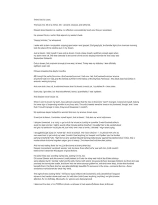 Bella has a dream where she sees her deceased grandmother. In the dream, Edward appears and puts his arm around Bella, exposing his skin glittering in the sunlight. Bella panics about her grandmother discovering Edward is a vampire. She then realizes it was just a mirror reflecting herself as an old woman, with Edward still young beside her. Bella wakes up realizing it is her 18th birthday, which she has been dreading as it is a reminder that Edward will never age like she will. She drives to school where Edward and Alice are waiting for her. Alice tries to get Bella to accept a birthday gift but Bella refuses, still disturbed by her dream.