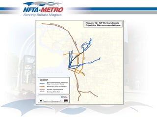 The document outlines transit restructuring efforts in the Buffalo Niagara region, highlighting the challenges of a declining population and the need for improved transportation infrastructure and services. It discusses various strategies to enhance transit connectivity and efficiency, including prioritizing key corridors and improving service frequencies to better link urban and suburban areas. The study reflects on community feedback, operational changes implemented, and the impact on ridership and productivity, emphasizing the importance of aligning transit policies with regional growth and economic development goals.