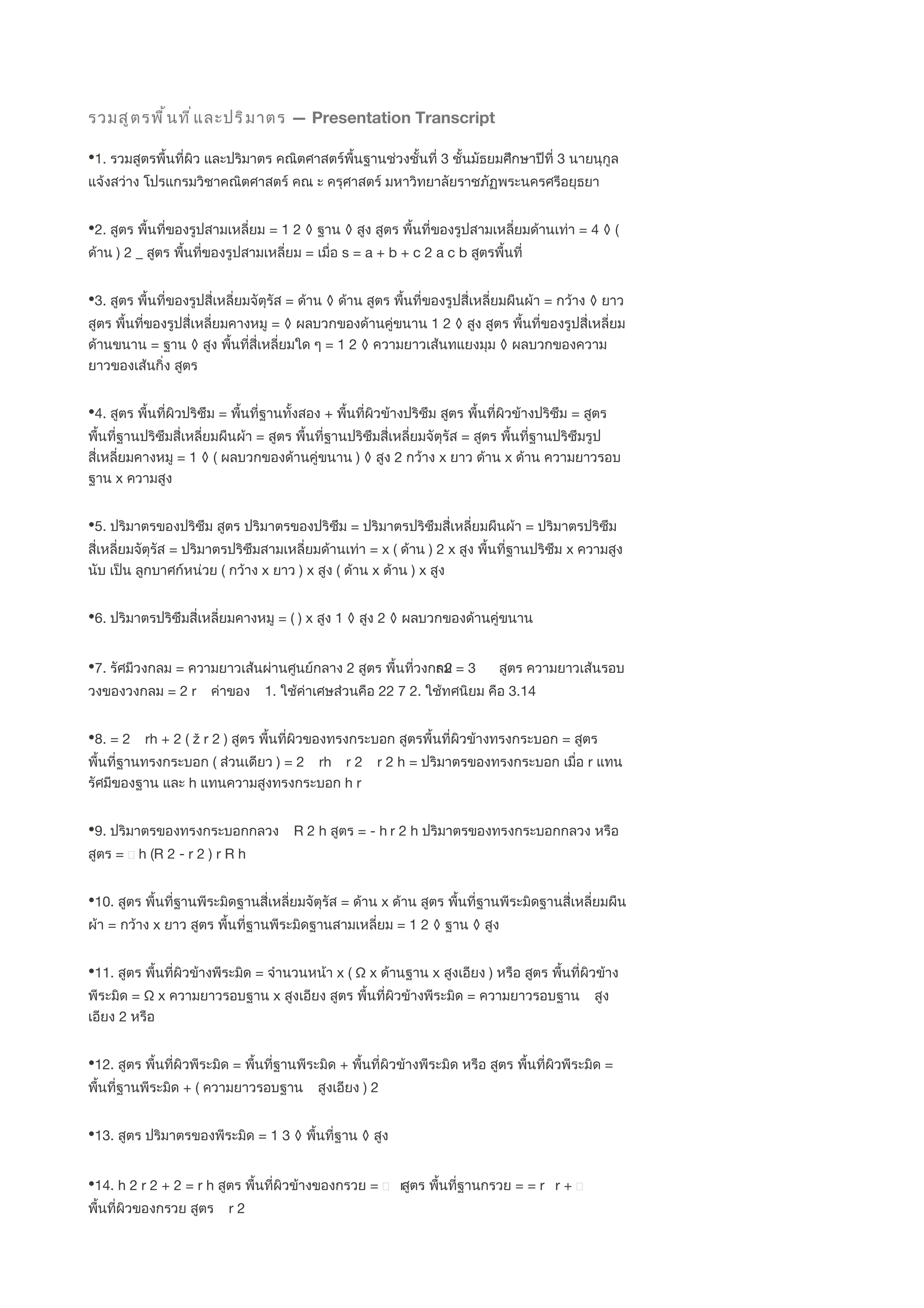 •1. รวมสูตรพื้นที่ผิว และปริมาตร คณิตศาสตร์พนฐานช่วงชั้นที่ 3 ชั้นมัธยมศึกษาปีที่ 3 นายนุกูล