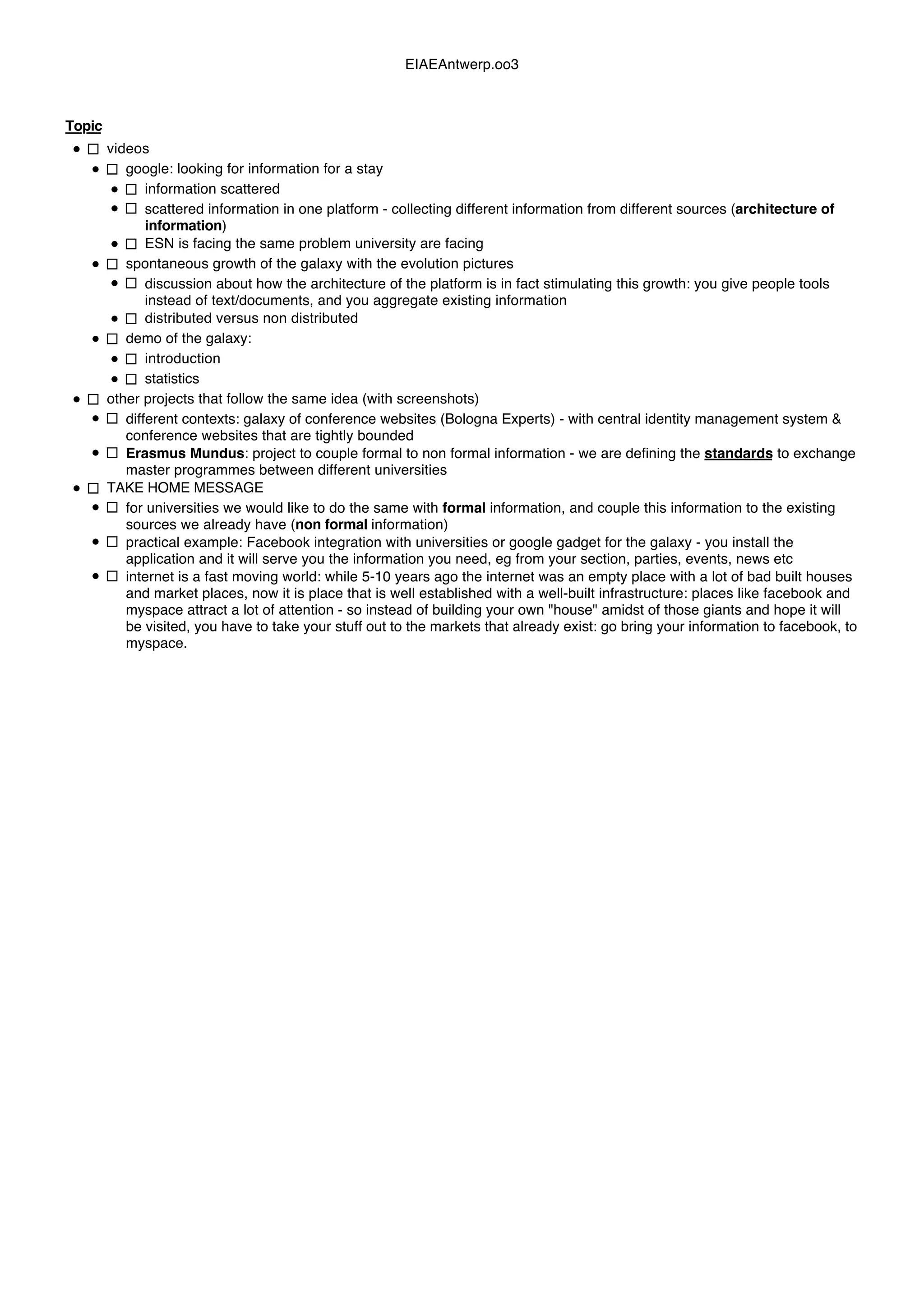 The document discusses building a centralized platform called EIAEAntwerp.oo3 that collects and aggregates information from different sources on a topic to provide users with a one-stop location to find all relevant information. It notes that existing networks like universities and Erasmus Student Network face challenges with information being scattered across multiple places. The platform aims to stimulate spontaneous growth around topics through visualization and aggregation tools similar to how galaxies have evolved over time. It provides an introduction and statistics on a demo of its information galaxy platform and mentions other related projects aggregating information from different contexts and domains.