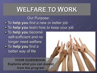 This document summarizes the Pathways to Success welfare-to-work program operated by the Shasta County Department of Social Services. The program aims to help participants find jobs, learn job skills, and become self-sufficient by getting off of welfare assistance. It explains the requirements participants must meet, such as engaging in job search or training activities, and the supportive services available to help with things like childcare, transportation and work expenses. Non-compliance can result in reduced or terminated cash aid benefits. The overall goal is to help people transition from welfare to employment and financial independence.