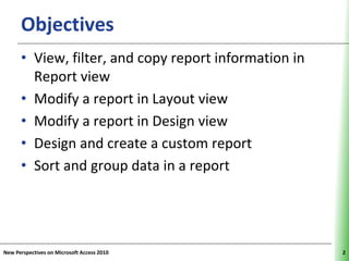 This document discusses how to create custom reports in Microsoft Access 2010. It covers viewing and modifying existing reports, designing new reports from scratch, sorting and grouping data, adding controls and formatting elements like dates, page numbers and titles. Specific report elements covered include labels, filtering duplicate values, and setting up a query as the record source. The overall goal is to teach the reader how to design customized reports to display their Access database data.