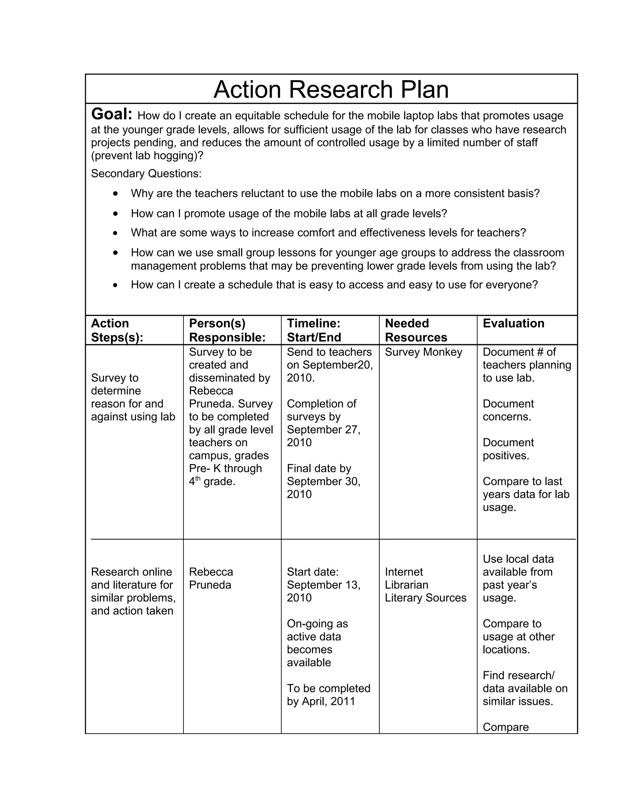 This document outlines an action research plan with the goal of creating an equitable schedule for mobile laptop labs that promotes their usage across grade levels. The plan involves surveying teachers to understand barriers to lab use, researching best practices, interviewing select teachers, creating mini-lessons to address needs, and using a wiki to document progress. Data will be collected through ongoing surveys, the interactive schedule, and wiki comments to evaluate the effectiveness of interventions in increasing equitable access to the mobile labs.