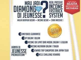 Jeunesse Global adalah perusahaan yang mengkhususkan diri dalam produk perawatan kulit anti penuaan dan kesehatan, dengan pendiri Randy Ray dan Wendy Lewis yang telah berhasil menembus lebih dari 80 negara sejak 2009. Produk unggulan mereka termasuk Luminesce Cellular Rejuvenation Serum dan Reserve, yang mengandung lebih dari 200 faktor pertumbuhan dan antioksidan untuk meningkatkan kesehatan kulit dan tubuh. Bisnis ini menawarkan berbagai peluang penghasilan melalui skema komisi dan bonus untuk para anggotanya.