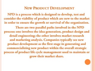 This document outlines the 8 steps in the new product development process: 1) idea generation, 2) idea screening, 3) concept development and testing, 4) business analysis, 5) beta testing and market testing, 6) technical implementation, 7) commercialization, and 8) new product pricing. It provides a flow from generating ideas to bringing new products to market.