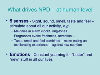 The document discusses factors that drive new product development (NPD), including human senses, emotions, trends, willingness to pay premium prices, and adapting to market and environmental changes. It outlines the NPD process from concept generation and prototyping to manufacturing and marketing. The future of NPD is seen as more collaborative with global design and production facilities and joint involvement of users and producers in product development.