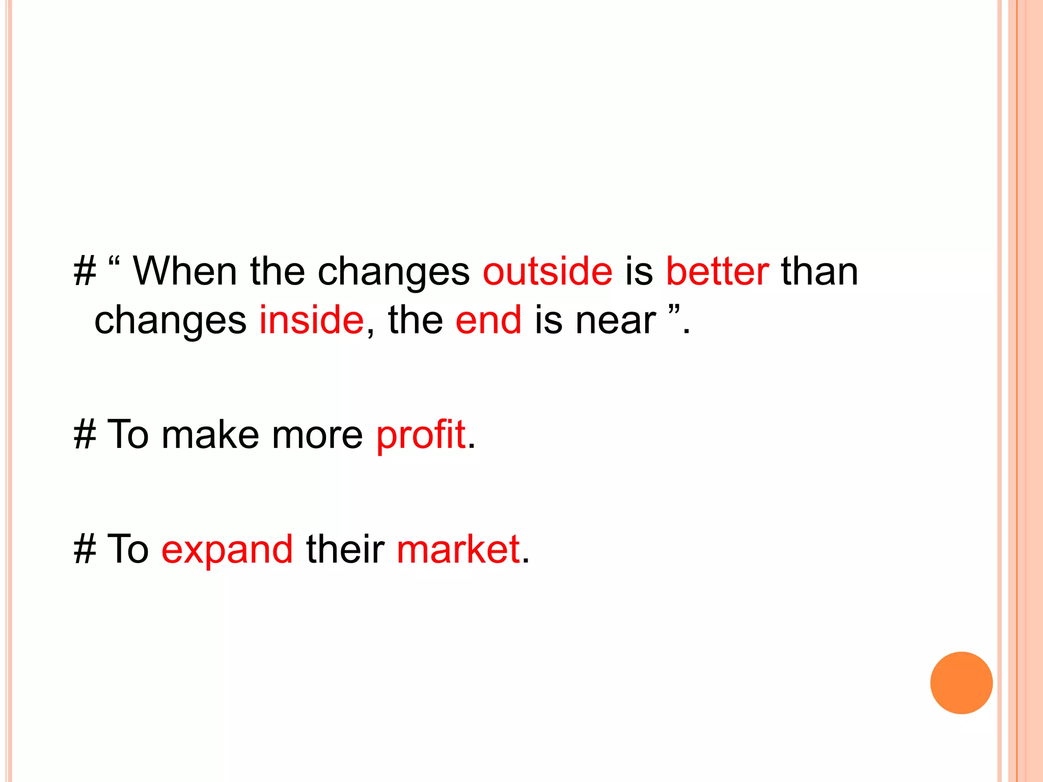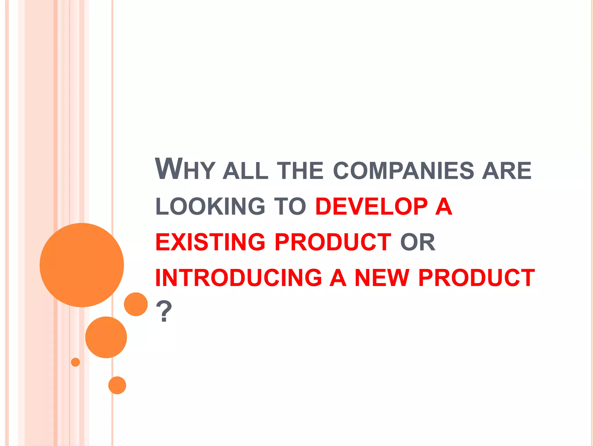 Companies develop existing products or introduce new products for three main reasons: to make more profit, expand their market, and respond to changes outside the company. The document then outlines the new product development process, which involves idea generation, screening, concept development and testing, market strategy, business analysis, product development, test marketing, and commercialization. It also discusses product life cycle strategies and how marketing strategies should be adapted for each stage from introduction to growth, maturity, and decline.
