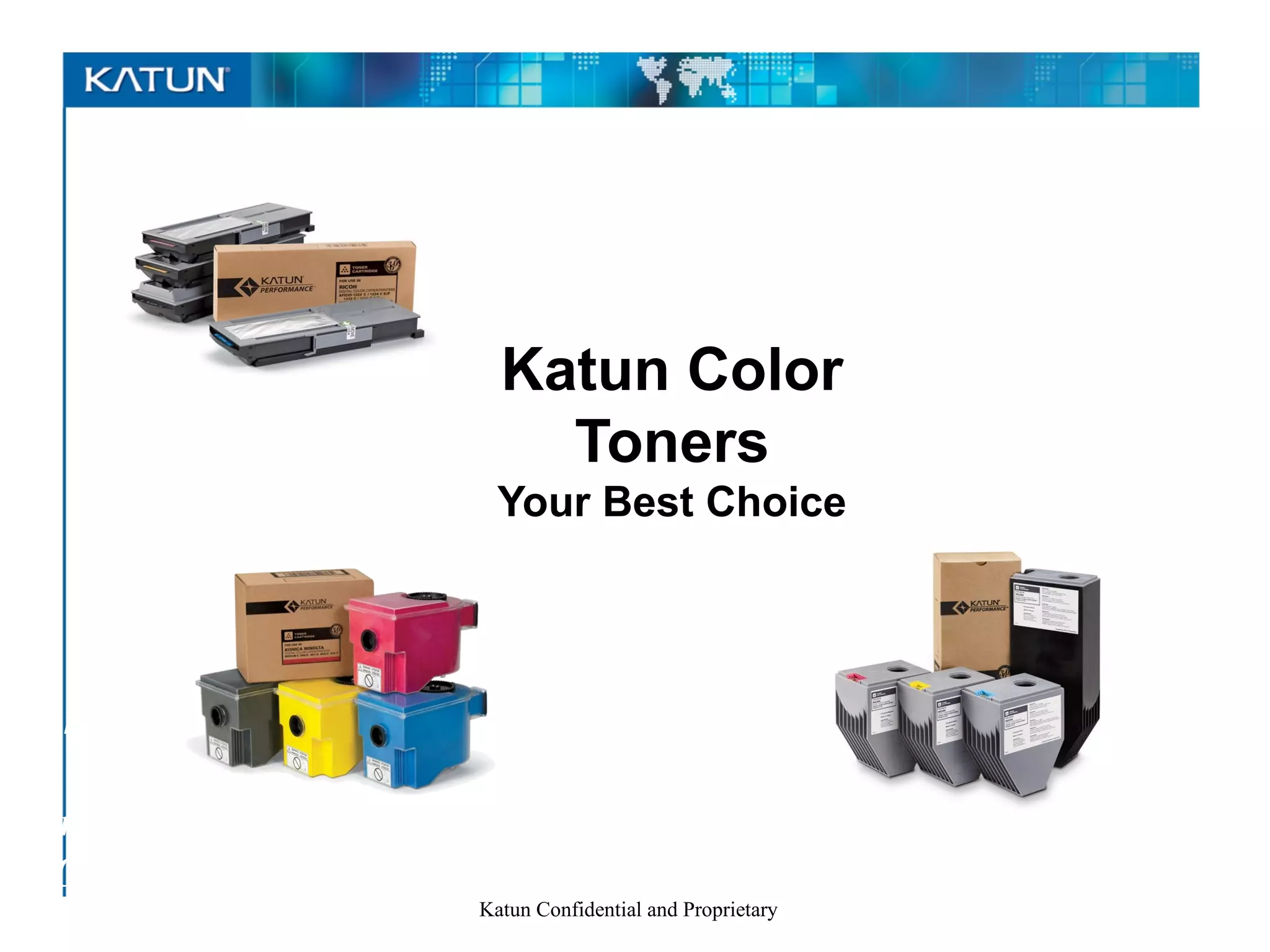 The document summarizes the advantages of using Katun color toners over original equipment manufacturer (OEM) toners. It states that Katun toners provide direct savings compared to OEM toners while delivering consistent, reliable performance backed by rigorous testing. Katun claims their toners match OEM quality in attributes like color matching, image density, and toner yield based on extensive lab evaluations. The document encourages readers to join other dealers and members who choose Katun toners.